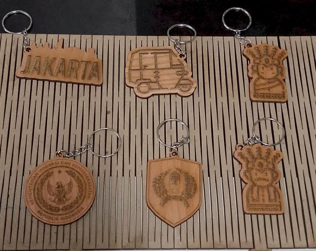 Selanjutnya, produk yang diproduksi mencakup gantungan kunci, plakat, pajangan ukir, serta suvenir yang dapat disesuaikan.